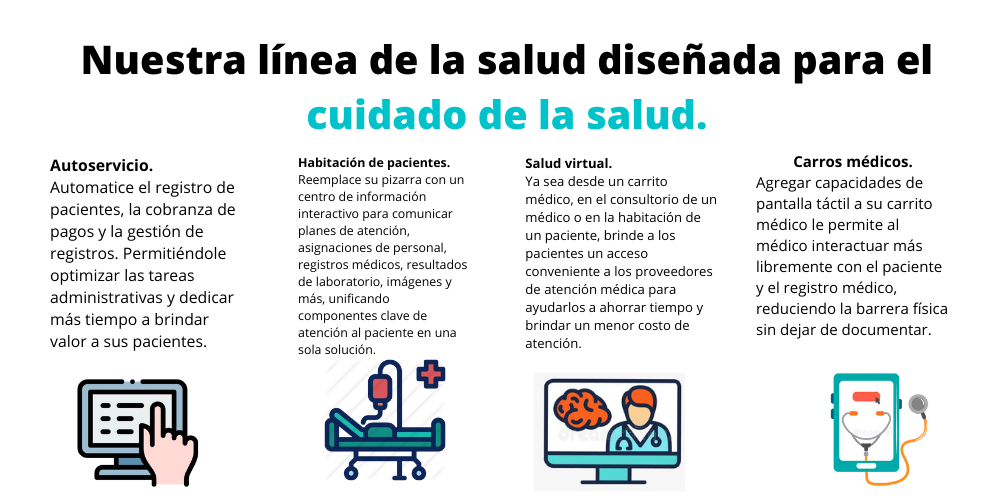 Con la línea de la salud que ofrece IPS puede asegurar un bienestar y un apoyo completo al personal médico, conectividad con dispositivos móviles, información rápida y segura de los pacientes, etiquetas de información y fácil lectura.